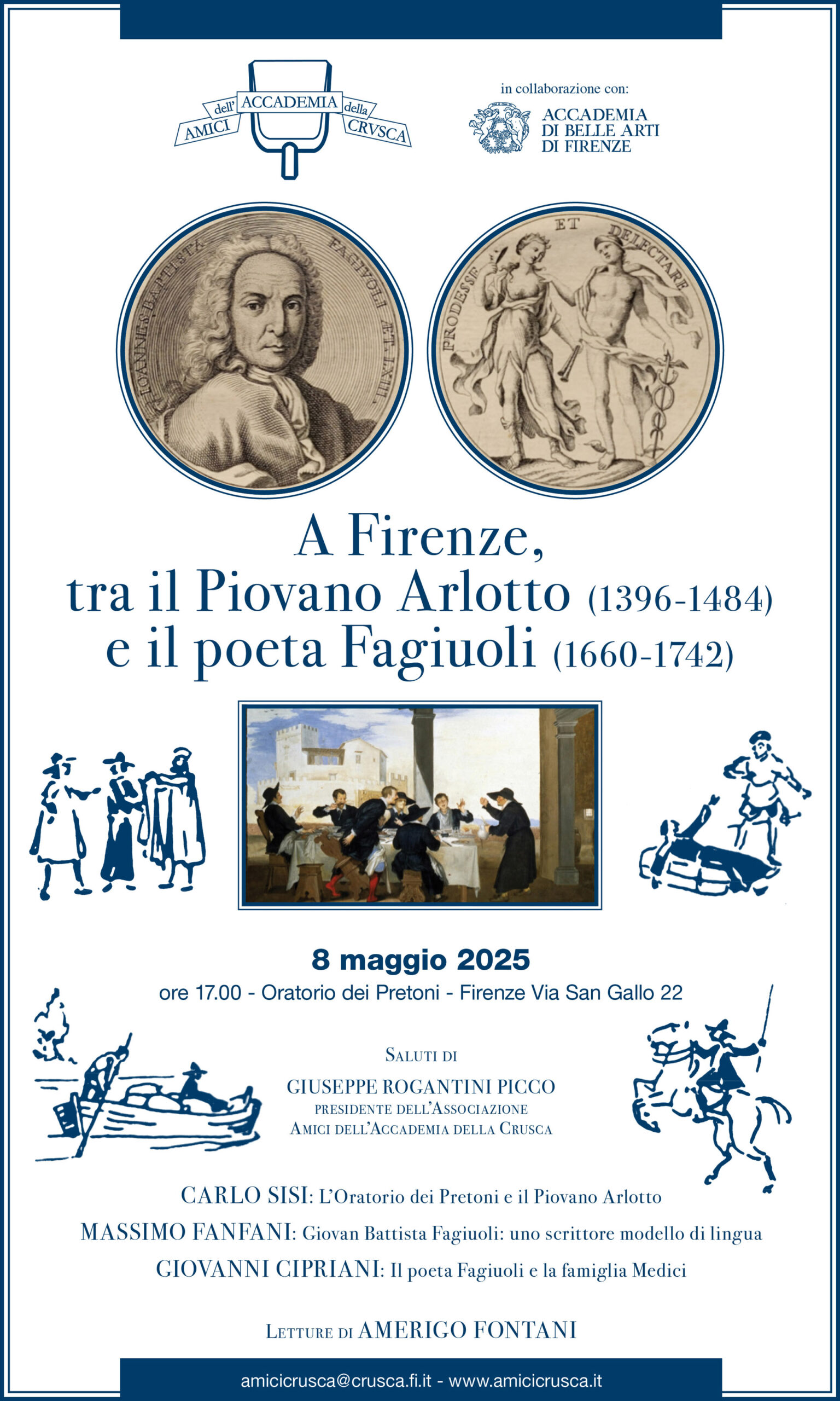 L’incontro è dedicato al piovano Arlotto Mainardi (1396-1484) e a Giovan Battista Fagiuoli (1660-1742), due personaggi significativi della vita culturale fiorentina, l’uno vissuto all’epoca di Lorenzo il Magnifico, l’altro sotto gli ultimi Medici, Cosimo III e Gian Gastone. Li accomuna il gusto burlesco e motteggiante, nel caso dell’Arlotto anche con qualche slittamento in una sapida volgarità. I loro nomi sono entrati nei modi di dire toscani e sono diventati quasi proverbiali. La diffusione delle loro opere è affidata rispettivamente ai Motti e facezie del Piovano Arlotto (postumi, circa 1514) e alle raccolte di Rime piacevoli (1729-1734) e alle numerose commedie.