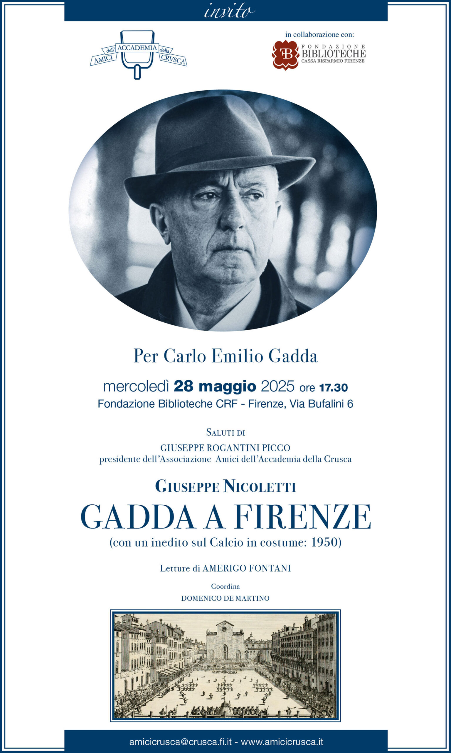 A partire dalla primavera del 1940, Carlo Emilio Gadda (Milano 1893 – Roma 1973), protagonista indiscusso della letteratura del nostro Novecento, volle stabilirsi a Firenze e qui finì per restare per un intero decennio durante il quale compose le sue opere più conosciute e memorabili. A distanza di più di 80 anni è certo interessante ricostruire caratteri e modalità dell’accoglienza riservatagli dai numerosi artisti e scrittori (non solo toscani) che in quegli anni difficili e cruciali frequentavano le istituzioni culturali nonché i celebri ritrovi della nostra città. Giuseppe Nicoletti, già docente dell’Università di Firenze, si addentrerà in questi temi, presentando fra l’altro la recente edizione di un sapido inedito gaddiano avente per tema e per titolo il fiorentinissimo Calcio in costume.
